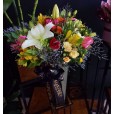Delicado Bouquet de Flores mistas composto por lírios,rosas, lisianthus, altroemérias, orquídeas chuva de ouro e complementos. ACOMPANHA LINDO VASO DE VIDRO