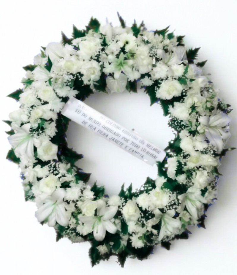 GUIRLANDA PAZ FLORES BRANCAS DIAMETRO DE 0,70 ACOMPANHA FAIXA COM MENSAGEM E CAVALETE .....