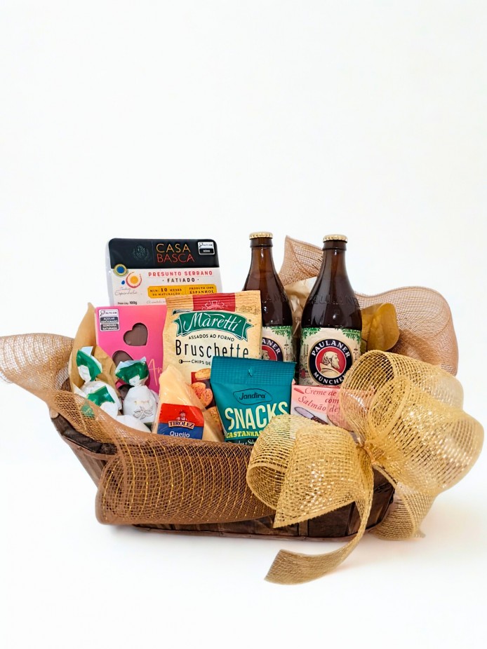 1 Cesta de Madeira crua contendo : - 2 Cervejas - 1stikisy - 1 Amendoin - 1 Bis - 1 Barra de chocola.....